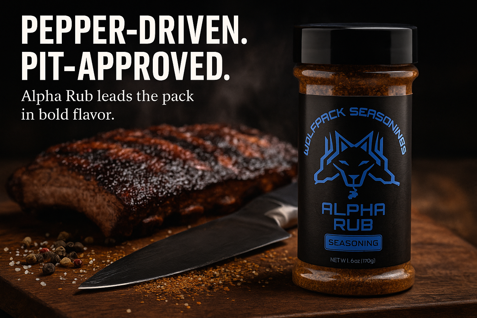 This is the rub that commands respect. Alpha Rub is pepper-forward, straight-shooting flavor with zero fluff. Built for ribs, brisket, steaks, and bold kitchen creations—it hits hard with black and white pepper, layered salt, and balanced bite. Whether you’re running a pellet grill or searing cast iron, this one leads the pack.